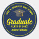 Cet autocollant moderne bleu marine et jaune personnalisé pour la remise des diplômes comporte votre nom de lycée ou de collège pour la classe de 2025. Customisez avec votre année de graduation sous l'écriture manuscrite en gras et casquette de grade pour les grands autocollants commémoratifs diplômés personnalisés.