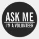Me demander | Black Volunteer Badge avec le titre "Ask Me, I'm a Volunteer" en blanc gras sans serif police sur arrière - plan noir.