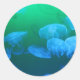 Photo atmosphérique de méduses transparentes nageant dans une mer bleue / verte.