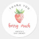 Carte d'invitation baby shower mignonne avec aquarelle illustrant les fraises. Le texte dit "un bébé doux aux baies est en route." Éléments correspondants disponibles.