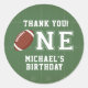 American Football merci les autocollants. Célébrez votre petit quart-arrière avec ce design d'anniversaire de football mignon, créé avec un arrière - plan de terrain de football avec "ONE" qui a un football à la place du "O". D'autres articles de fête sont disponibles à la boutique Metro-Events Zazzle et à Metro-Event.com.