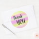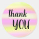 Ce joli autocollant est parfait pour les scellés d'enveloppe, les cadeaux de remerciement, et plus encore! Une aquarelle chaude de rose, d'orange, de jaune et de vert clair recouvre l'autocollant, donnant un air de coucher de soleil ou de sherbet. Overlay est le message "merci" en noir, dans un style de brosse gonflable combinant écriture de script et de bloc. Idéal pour les occasions estivales ou toute l'année !