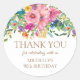 Belle aquarelle colorée rose, jaune et bleu florale sur autocollant de Merci d'anniversaire personnalisé blanc. Personnalisé avec le nom et l'âge de l'invité d'honneur. Contactez-nous pour obtenir de l'aide sur la personnalisation ou pour demander des produits correspondants.