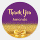 Arrière - plan élégant violet, violet et doré brillant avec un faux ruban d'or et un arc. Modèle pour un nom et le texte : Merci. Lettres d'or. Parfait pour un anniversaire, un anniversaire, une douche nuptiale ou un baby shower.