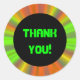Autocollants "Merci" ronds personnalisables avec texte vert citron. L'art numérique qui l'accompagne présente un design fractal abstrait fluorescent orange, vert et jaune, mais vous pouvez ajouter votre propre photo ou image. Le cercle noir vous donne une zone sur la conception pour ajouter du texte personnalisé. Customisez le style, la taille et la couleur de la police selon les besoins pour votre message texte personnalisé.