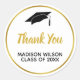 Une casquette de graduation est en haut de cet autocollant blanc et faux or. Vous pouvez personnaliser vos autocollants avec votre message sous le casquette. (Montré : 'Merci Graduate Name Class of 20xx). La bordure est fausse or. Le look métallique or est un rendu artistique car il ne s'agit pas d'un autocollant de feuille.