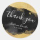 Cet autocollant de remerciement simple et élégant est conçu pour coordonner avec votre Bar ou Bat mitzvah célébration. "Merci" est affiché au centre dans une police de script fluide pour une touche chaleureuse et personnelle. Ci-dessous, le nom et la date de l'événement de Mitzvah sont présentés dans une police serif classique, ajoutant une sensation intemporelle. L'arrière - plan est un noir sophistiqué avec des accents d'aquarelle ou d'encre d'alcool faux or en haut et en bas pour un look raffiné. Entièrement personnalisable, vous pouvez modifier le texte, les couleurs de police et les illustrations pour qu'ils correspondent au thème de votre événement. Une façon élégante et significative de montrer l'appréciation à vos invités.