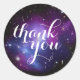 Magnifique mariage céleste moderne merci autocollants. L'arrière - plan est une belle image cosmique de galaxie violette. Le texte est entièrement personnalisable. Par exemple, vous pouvez ajouter des majuscules ou déplacer les mots.