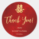 Mariage chinois merci autocollant avec un double symbole de bonheur artistique or sur un arrière - plan rouge chatoyant. Vos mots "Merci" sont écrits dans une écriture manuscrite élégante, les noms de mariée et de mariée et la date mariage dans une police sans serif moderne.