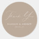 Élégant autocollant de mariage affichant "Merci" dans un magnifique script de calligraphie blanche avec un arrière - plan taupe ou couleur de votre choix. Personnalisez les autocollants de remerciement modernes avec vos noms et date mariage. Les autocollants de remerciement taupe mariage sont parfaits pour sceller les enveloppes de carte de remerciements, les sacs de faveur de mariage, etc.