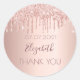 Un autocollant, une étiquette de faveur pour une douche de la mariée glamour et girly. Un fond métallisé rose or faux avec un effet de gouttes de paillettes rose or faux, de peinture qui goutte élégant. Le texte : Merci. Modèle pour le nom et la date. Le nom est écrit en rose or foncé avec un style de lettrage à la main moderne et grand script.