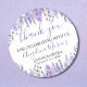 Ajoutez une touche fantaisiste et élégante à vos faveurs de fête, bougies, réglages de table, fermetures d'enveloppe, et plus encore avec ce design d'autocollant rond ! Doté d'un thème de jardin de lilas et de lavande charmant, l'autocollant présente de délicates tiges de lavande à l'aquarelle dans diverses nuances de violet, associées à des feuilles vertes douces. Au centre, « Merci » est écrit en belles lettres cursives violettes, avec « pour avoir célébré avec nous » en dessous dans une simple police serif, créant un bel équilibre d'élégance et de simplicité. Parfait pour les célébrations de Quinceañera, cet autocollant polyvalent peut également être personnalisé en changeant les couleurs de police ou l'arrière-plan pour s'adapter à votre style. Autocollant Rond Classique Merci