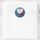 Bons stickers d'espace pois bleu. Un grand coeur d'amour blanc avec les mots merci à l'intérieur. En bas à droite se trouve un vaisseau-fusée rouge qui traverse l'espace avec trois étoiles jaunes à droite de la fusée.