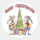Deux mignonnes souris de vacances, l'une tenant un sucre de canne et l'autre tenant un cadeau debout devant un arbre de Noël avec le texte 'Joyeux Noël'.