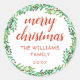 sticker de Noël rond avec "joyeux noël" écrit dans un script de calligraphie rouge avec votre nom et l'année à l'intérieur d'une couronne dessinée à la main de feuilles dans différentes nuances de vert avec beaucoup de petits fruits rouges.