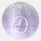 Personnalisez facilement ce design chic et élégant autocollant rond avec une jolie parties scintillant brillante en argent sur un arrière - plan métallique brossé violet.