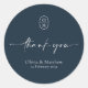 Chic et élégant avec une esthétique minimaliste. Cet autocollant de remerciement de mariage minimaliste présente une police contemporaine et un monogramme de couple marié sur un fond de couleur bleu minuit foncé.