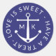 Les stickers de mariage bleu marine avec une jolie ancre décorée de coeurs. L'amour est sucré - avoir un régal est écrit dans un cercle autour de l'ancre. Ajoutez vos initiales.