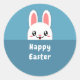 Un sticker Happy Pâques drôle : il est livré avec un mignon lapin blanc avec des oreilles roses dans le style Kawaii sur les tons arrière - plans bleus. Cela pourrait aussi être utilisé pour l'anniversaire, le baby shower ou le remerciement!