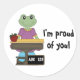 Un autocollant mignon pour les parents ou les enseignants à donner à l'élève pour faire du bon travail en classe, avec une petite grenouille assise sur un bureau avec une pomme et une règle. Le "Je suis fier de toi !" peut être customisé.