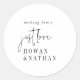 Ce sticker moderne chic noir et blanc juste amour mariage classique rond collant est parfait pour un mariage simple. Le design boho minimaliste présente une typographie bohème rustique unique et élégante dans un noir et blanc épuré minimal. Personnalisez le étiquette avec les noms du couple. Utilisez les étiquettes comme autocollants de faveur de mariage ou comme sceau d'enveloppe.