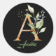 Moderne tendance Un monogramme vert et or feuille noir classique rond autocollant personnalisé avec le nom, peut être utilisé pour la Fête des mariées, Baby shower, Fiançailles Mariage, Anniversaire ou fête d'anniversaire. Le design Extraordinaire présente des feuilles d'eucalyptus vert aquarelle tissés en lettre A et des éclaboussures et éclaboussures en faux or mélangés. Eucalyptus feuilles de verdure élégamment tissé en faux feuille d'or lettre A et donne à l'esthétique à toute la vision. Personnalisé avec le nom, Design peut être utilisé pour la Fête des mariées, le Baby shower, le Fiançailles Mariage, Anniversaire ou fête d'anniversaire. Contactez-moi pour les articles correspondants ou pour la personnalisation, Violet Prints ©