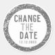 Un changement moderne l'autocollant de date avec un cadre de bague de parties scintillant argent. Les scellés d'enveloppe peuvent être utilisés pour partager votre changement de plan en mariage, fiançailles, douche nuptiale, baby shower, date de fête.