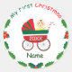 Un bébé dans la poussette en rouge et vert, et décorations avec "Mon premier Noël". Un cadeau de Noël mignon et unique pour les bébés pour se souvenir du premier Noël de votre bébé.