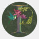 Un colibri aux bleus et verts irisés, buvant d'une fleur rose foncée ornée suspendue à une première I métallique, chatoyant dans les couleurs arc-en-ciel.