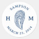 Parfait pour un mariage côtier, une fête de fiançailles ou autre événement, cet autocollant blanc rond présente des caractéristiques faciles à modifier autour d'une coquille d'huîtres illustrée pour ajouter un peu de flair côtier aux enveloppes, faveurs et plus encore.