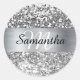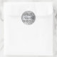 Créez votre autocollant rond classique avec une parties scintillant de style chunky à confetti gris brillant, avec une bande de papier métallique brossé brillant et brillant pour le monogramme. Le monogramme noir et blanc et le prénom sont dotés d'un script de calligraphie moderne qui peut être customisé. Certaines lettres devront être déplacées vers le centre avec cette belle calligraphie. La bande et la parties scintillant de faux film de luxe sont numériquement images créées qui s'impriment comme une photo.