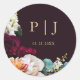 Ces élégants autocollants de mariage monogramme personnalisés présentent une bordure florale de fleurs roses, pêche et bordeaux sur un arrière - plan bordeaux avec les initiales monogrammes de la mariée et du marié ainsi que leur date mariage en fausse calligraphie or pour personnaliser. Conçu par Susan Coffey.