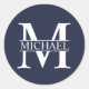 Monogramme personnalisé et cadeaux de nom avec monogramme blanc personnalisé dans le style de police serif classique avec boîte de nom au milieu du monogramme sur arrière - plan bleu marine.