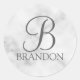 avec monogramme personnalisé en gris dans le style d'écriture classique et nom en gris dans le style de police serif classique sur fond de marbre blanc.