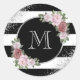 Autocollant de monogramme floral rayé noir et argent élégant.
