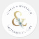 Autocollants ronds imprimés sur mesure, parfaits pour les étiquettes de mariage, merci cadeaux ou enveloppes mariages monogrammées. Cet élégant design moderne présente un esperon en feuille d'or imitant les fleurs délicates et la verdure. Personnalisez-le avec le nom de la mariée et du marié et la date du mariage dans toutes les polices et couleurs que vous voulez. Utilisez les outils de conception pour éditer le texte ou ajouter vos propres photos pour créer un autocollant mariage de type !