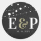 Sticker Rond Classique Monogram Mariage Minimal Chalkboard String Lights. Le design a de l'espace pour ajouter les initiales monogrammes de la mariée et du marié sur un beau tableau et des lampes à cordes arrière - plan. Ces jolis autocollants design d'enveloppe peuvent être customisés en changeant les monogrammes de la mariée et du marié et la date du mariage. Pour toute personnalisation supplémentaire, n'hésitez pas à me contacter à l'adresse mypaperlove2021@gmail.com