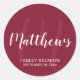 Monogramme personnalisé et nom de famille Favor Stickers disposent de nom de famille en blanc style de police de script moderne et monogramme en rouge clair style de police de script moderne en arrière - plan avec détails en blanc sans serif style de police sur arrière - plan rouge bordeaux. Parfait pour les réunions de famille et les occasions spéciales.