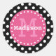 Motif à pois mignon et girly en noir et blanc avec un cadre étiquette rose tendance avec points blancs, lettre initiale monogramme personnalisée et nom personnalisé. Un cadeau élégant personnalisable pour une fille ou une femme qui aime les motifs géométriques élégants qui sont personnalisés.