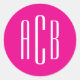 Conception moderne de monogramme de trois lettres en blanc sur des autocollants ronds solides rose chaud. Une police mince de style minimaliste 3 design initial fonctionne pour un monogramme mariage ou pour un individu. Customisez la taille, la couleur ou le placement de la police selon vos besoins.