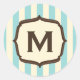 Un autocollant monogramme d'inspiration cirque vintage avec un arrière - plan rayé bleu et blanc. Personnalisez avec votre monogramme dans un cadre brun intérieur brun.