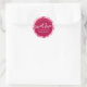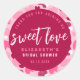 Autocollant rond classique de Shower de mariage de la Saint-Valentin avec motif de cœur d'amour doux. Autocollant de shower de mariage personnalisé avec nom et date "Sweet Love" pour la Saint-Valentin, avec fond rose pastel et cœurs roses, blancs, magenta et bordeaux. Modèle facile à personnaliser.