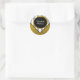 Servez des friandises dans un sac de faveur ou scellez le courrier avec cet autocollant élégant. Ce motif rayé en zigzag noir et blanc met en valeur le haut de cet autocollant avec un cercle de calligraphie à paillettons dorés et un texte sur un fond à paillettons dorés. Remplissez les champs de modèle ou cliquez sur personnaliser pour sélectionner un style de police, une taille et une couleur qui vous plaisent.