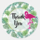 Un autocollant de remerciement avec un motif feuille vert tropical et une illustration de flamand rose superposé qui ajoute une touche de fantaisie.