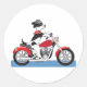Un chien conduit une moto rouge. Ses oreilles, son foulard et sa queue volent dans le vent et son casque a des décalcomanies.