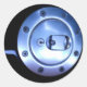Le casquette à carburant rond en argent métallique sur le réservoir à carburant noir d'une moto crée un design minimaliste géométrique, imprimé avec art de la photographie par S.Lynnette
