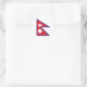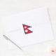 Drapeau du Népal. Le drapeau national du Népal (népalais : ने पा ल को झ डा) est le seul drapeau national non quadrilatéral au monde. Le drapeau est une combinaison simplifiée de deux pennons simples, le mot vexillologique pour un pennant. Jusqu'en 1962, les emblèmes du drapeau, le soleil et le croissant de lune, avaient des visages humains. Ils ont été retirés pour moderniser le drapeau. La frontière bleue symbolise la paix et l'harmonie qui prévalent dans le pays depuis l'âge de Gautama Bouddha, né au Népal. Le rouge pourpre est la couleur nationale du Népal, et il indique les esprits courageux du peuple népalais. Les deux triangles symbolisent les montagnes de l'Himalaya et pourraient représenter les deux principales religions, l'hindouisme et le bouddhisme. Le drapeau triangulaire rouge est un symbole hindou de la victoire depuis le Ramayana et le Mahabharata. La représentation des corps célestes représente la permanence, l'espoir que le Népal sera dernier aussi longtemps que le soleil et la lune. La lune symbolise que les Népalais sont apaisants et calmes, tandis que le soleil symbolise une détermination féroce. La lune symbolise aussi les nuances et le temps cool de l'Himalaya, tandis que le soleil symbolise la chaleur et la haute température dans la partie basse (Tarai) du Népal. Autre interprétation : La forme du drapeau symbolise une pagode népalaise. Mettre un miroir sur le côté du drapeau le plus proche du mât créera une image de pagode.
