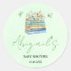 Watercolor New Chapter Begins gender neutral baby shower sticker. This baby shower sticker is designed to capture the magic of new beginnings. Ideal for a book-themed baby showers, this beautifull design showcases a delightful stack of books bound with rope, topped with exquisite floral arrangements and fluttering green butterflies—symbols of transformation and joy. The mother’s name is in elegant green script typography, bringing a touch of sophistication to the design. The soft green watercolor background enhances the dreamy aesthetic.