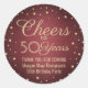 Ajoutez une touche de finition personnalisée à la fête d'anniversaire merci notes ou faveurs avec ces stickers ronds bordeaux et or / enveloppes scellés. Ce modèle est mis en place pour un 50ème anniversaire, mais il est simple de customiser à une autre année ou un autre événement, comme un anniversaire. Le design comporte des points de confetti à l'aspect feuille sur un arrière - plan en acier inoxydable brossé en faux rouge marron, la calligraphie de script "Cheers to 50 years" et la typographie minimaliste moderne message modifiable en bas. Veuillez noter que l'or est imprimé en couleur et non en métal.