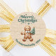 Faux burlap beige comme arrière - plan, texte vert. Joyeux Noël est écrit avec une police de style rétro. Décoré d'un homme en pain d'épices tenant un sapin de Noël. Personnalisez et ajoutez votre nom de famille et une année. Une image de burlap, pas un vrai tissu.